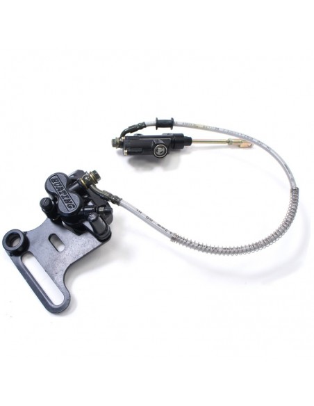 Frein hydraulique arrière double pistons complet pour Dirt Bike / Pit bike de 50 à 250cc livré prêt à l'emploi et déjà purgé ! Il ne vous reste plus qu'à l'installer sur votre mini ! Ce kit est composé: