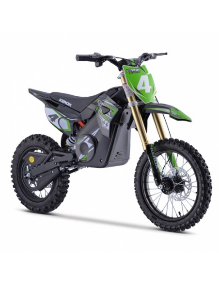 Mini Moto Dirt Bike Pit Bike KEROX E-STORM spécial enfant équipé d'une roue 14 Pouces à l'avant et 12 Pouces à l'arrière (14 / 12). Cette dirtbike électrique, 48V 1800W - MOTEUR BRUSHLESS, grâce à de nombreux avantages séduira parents comme enfants ! MODELE HAUT DE GAMME DE CHEZ KEROX !!!! Importateur Français distributeur BASTOS BIKE avec un excellent SAV / dispo pièces !**** ATTENTION CE MODÈLE EST PLUS GRAND ET PLUS PUISSANT QU'UNE POCKET BIKE / A PARTIR DE 6 ANS !!! **** Cette moto permettra à l’enfant (dès 6-8 ans / Hauteur de selle 68 cms) de découvrir le sport mécanique fabuleux qu'est la moto, sans se ruiner et tout en gardant le meilleur rapport qualité prix du marché ! De plus cette moto respecte une règle importante: Économique, Écologique et Silencieuse (0 bruit) ! De plus les modèles électriques ne nécessitent quasiment aucun entretien ! Cette mini moto est idéale et peut être utilisée dans votre jardin sans que vos voisins ne soient dérangés !!! Les + de la marque KEROX :- Partie cycle de dirt bike / Pit Bike donc beaucoup plus robuste qu'une pocket bike !- Roues avant et arrière racing à rayons (comme sur les Dirt Bike)- Châssis et Bras oscillant renforcé !- Colonne de direction monté sur roulement (aucun jeu possible)- Fourche inversée pour plus de confort et de robustesse - Amortisseur arrière de haute qualité réglable et moins dur !- Vitesse réglable **- Temps de réponse de la poignée réglable **** Ces paramètres sont réglables grâce aux molettes de la machine visible sur la dernière photo !Vous n'aurez pas de mauvaises surprises comparé à des modèles similaires ne possédant les améliorations importantes de la marque KEROX !! - MOTEUR
