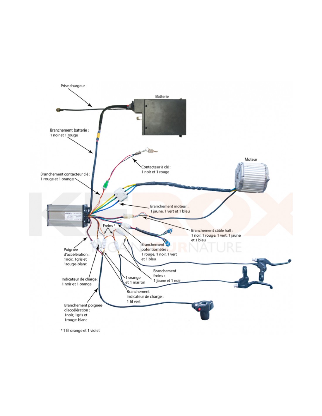 - 3x cosses 2 fils "BRAKE" (1 fil violet et 1 fil orange) pour les contacteurs de frein Avant et Arrière et un retour sur la poignée d'accélérateur