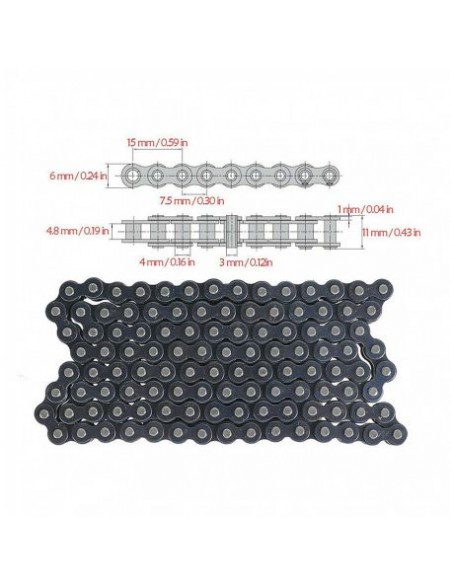 Chaine spécifique modèle électrique pour Mini Moto / Quad / Mini Quad / ATV enfant électrique 36V 1000W ou 48V 1300W type Xtrem 81, Diamond Dynostar, SMX... Cette chaîne est de type #219H et possède les caractéristiques suivantes :