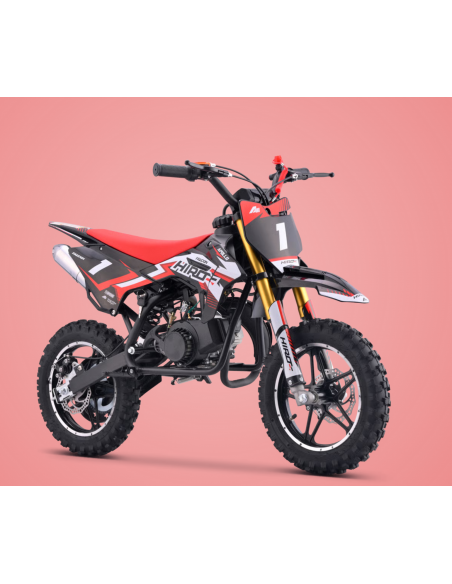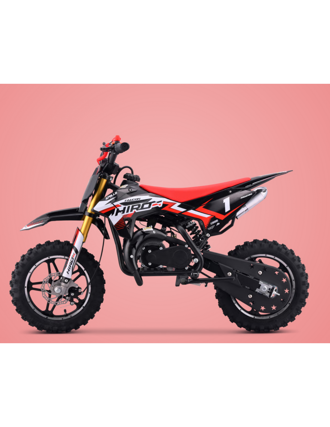 Pocket Bike cross 49cc APOLLO MOTORS modèle HIRO FALCON racing (réplique de motocross) 49cc XL équipée de roues 10 Pouces. Cette mini dirt bike cross est équipée d’un moteur automatique qui ravira les grands comme les petits ! MODELE HAUT DE GAMME DE CHEZ APOLLO MOTORS !!!! Importateur Francais distributeur avec un excellent SAV / dispo pièces ! Sa vitesse bridable dès 5-10 km/h et son coupe circuit type jet ski permettra de mettre pilote et parents en toute sécurité ! Cette moto permettra à l’enfant (dès 5 ans) de découvrir le sport mécanique fabuleux qu'est la moto, sans se ruiner tout en gardant le meilleur rapport qualité prix du marché ! Elle est équipée d'un coupe circuit en cas de chute ! Les + de la marque APOLLO:- Colonne de direction monté sur roulement (aucun jeu possible)- Silent bloc en teflon (beaucoup moins de jeu et d'usure dans le temps) - Nouveau guidon Fat bar moins large et mieux adapté aux plus jeunes- Amortisseur arrière réglable et moins dur ! De plus avec ses nombreuses améliorations (voir photos), cette moto s'est fiabilisée avec le temps: lanceur renforcé, embrayage renforcé, cales pieds renforcés, fourche inversée, guidon aluminium, freins à disques avant et arrière, chaine renforcée !!! - MOTEUR