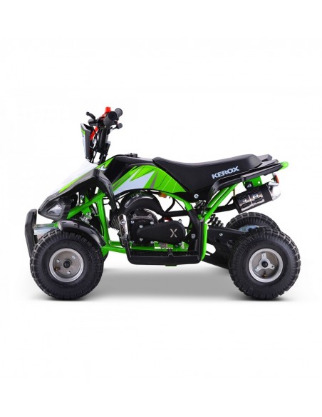 Pocket Quad KEROX Rex (Mini ATV) équipé de roue 4 Pouces. Ce quad grâce à de nombreux avantages séduira parents comme enfants ! MODELE HAUT DE GAMME DE CHEZ KEROX !!!! Importateur Francais distributeur BASTOS BIKE avec un excellent SAV / dispo pièces ! Sa vitesse bridable dès 5 km/h et son coupe circuit type jet ski permettra de mettre pilote et parents en toute sécurité ! Ce quad permettra à l’enfant (dès 3 ans) de découvrir le sport mécanique fabuleux qu'est le quad, sans se ruiner et tout en gardant le meilleur rapport qualité prix du marché ! Les + de la marque KEROX:- Colonne de direction monté sur bague (aucun jeu possible)- Biellettes de direction serties et inversées (beaucoup moins de jeu et d'usure dans le temps)- Fusée de train avant monté sur roulements (pas d'usure ni de jeu comparé à du plastique)- Nouveau guidon moins large et mieux adapté aux plus jeunes- Amortisseur avant / arrière réglable et moins dur ! De plus avec ses nombreuses améliorations (voir photos), ce quad s'est fiabilisé avec le temps: lanceur aluminium renforcé, embrayage renforcé, biellettes renforcées, guidon aluminium, freins à disques avant (double) et arrière, chaine renforcée !!! - MOTEUR
