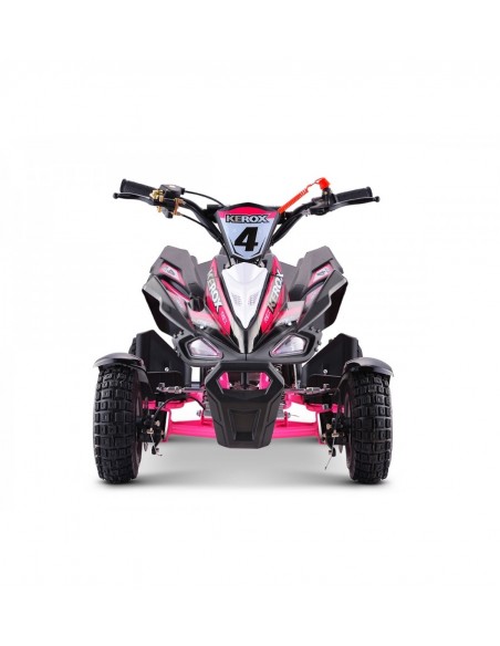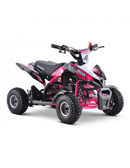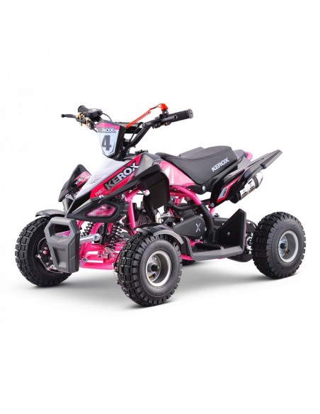Pocket Quad KEROX Rex (Mini ATV) équipé de roue 4 Pouces. Ce quad grâce à de nombreux avantages séduira parents comme enfants ! MODELE HAUT DE GAMME DE CHEZ KEROX !!!! Importateur Francais distributeur BASTOS BIKE avec un excellent SAV / dispo pièces ! Sa vitesse bridable dès 5 km/h et son coupe circuit type jet ski permettra de mettre pilote et parents en toute sécurité ! Ce quad permettra à l’enfant (dès 3 ans) de découvrir le sport mécanique fabuleux qu'est le quad, sans se ruiner et tout en gardant le meilleur rapport qualité prix du marché ! Les + de la marque KEROX:- Colonne de direction monté sur bague (aucun jeu possible)- Biellettes de direction serties et inversées (beaucoup moins de jeu et d'usure dans le temps)- Fusée de train avant monté sur roulements (pas d'usure ni de jeu comparé à du plastique)- Nouveau guidon moins large et mieux adapté aux plus jeunes- Amortisseur avant / arrière réglable et moins dur ! De plus avec ses nombreuses améliorations (voir photos), ce quad s'est fiabilisé avec le temps: lanceur aluminium renforcé, embrayage renforcé, biellettes renforcées, guidon aluminium, freins à disques avant (double) et arrière, chaine renforcée !!! - MOTEUR