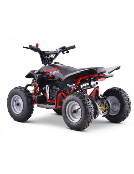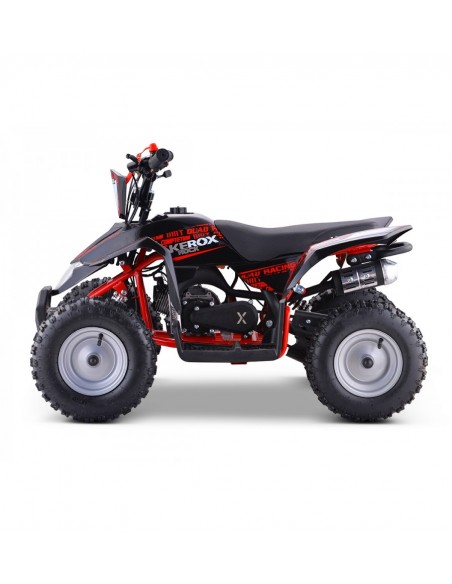 Pocket Quad KEROX ROCK BW6 (Mini ATV) équipé de roue 6 Pouces. Ce quad grâce à de nombreux avantages séduira parents comme enfants ! MODELE HAUT DE GAMME DE CHEZ KEROX !!!! Importateur Francais distributeur BASTOS BIKE avec un excellent SAV / dispo pièces ! Sa vitesse bridable dès 5 km/h et son coupe circuit type jet ski permettra de mettre pilote et parents en toute sécurité ! Ce quad permettra à l’enfant (dès 3/4 ans) de découvrir le sport mécanique fabuleux qu'est le quad, sans se ruiner et tout en gardant le meilleur rapport qualité prix du marché ! De plus avec ses nombreuses améliorations (voir photos), ce quad s'est fiabilisé avec le temps: lanceur aluminium renforcé, embrayage renforcé, biellettes renforcées, guidon aluminium, freins à disques avant (double) et arrière, chaine renforcée !!! Les + de la marque KEROX:- Colonne de direction monté sur bague (aucun jeu possible)- Biellettes de direction serties et inversées (beaucoup moins de jeu et d'usure dans le temps)- Fusée de train avant monté sur roulements (pas d'usure ni de jeu comparé à du plastique)- Nouveau guidon moins large et mieux adapté aux plus jeunes- Amortisseur avant / arrière réglable et moins dur ! - MOTEUR