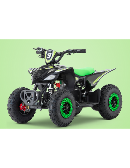 De plus les modèles électriques ne nécessitent quasiment aucun entretien ! Ce mini quad est idéal et peut être utilisé dans votre jardin sans que vos voisins ne soient dérangés !!! De plus avec ses nombreuses améliorations (voir photos), ce quad s'est fiabilisé avec le temps: biellettes renforcées, guidon renforcé, freins à disques avant (double) et arrière, chaine renforcée !!! Les + de la marque APOLLO MOTORS:- Colonne de direction monté sur bague- Biellettes de direction serties et inversées (beaucoup moins de jeu et d'usure dans le temps)- Fusée de train avant monté sur roulements (pas d'usure ni de jeu comparé à du plastique)- Nouveau guidon moins large et mieux adapté aux plus jeunes- Amortisseur avant / arrière réglable et moins dur !- Train avant à bras séparé !- Vitesse bridable 3 positions: Vitesse 1 = 7km/h, Vitesse 2 = 15km/h, Vitesse 3 = 25 km/h (Vitesse MAX) Vous n'aurez pas de mauvaises surprises comparé à des modèles similaires ne possédant les améliorations importantes de la marque APOLLO MOTORS !! - MOTEUR- Moteur 800W 36V Silencieux, économique et écologique !