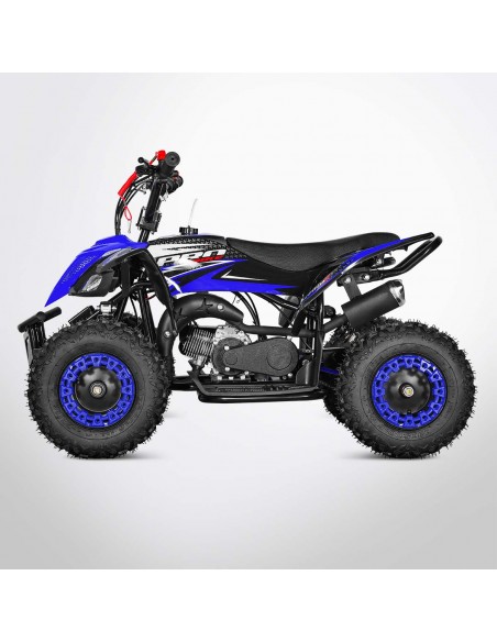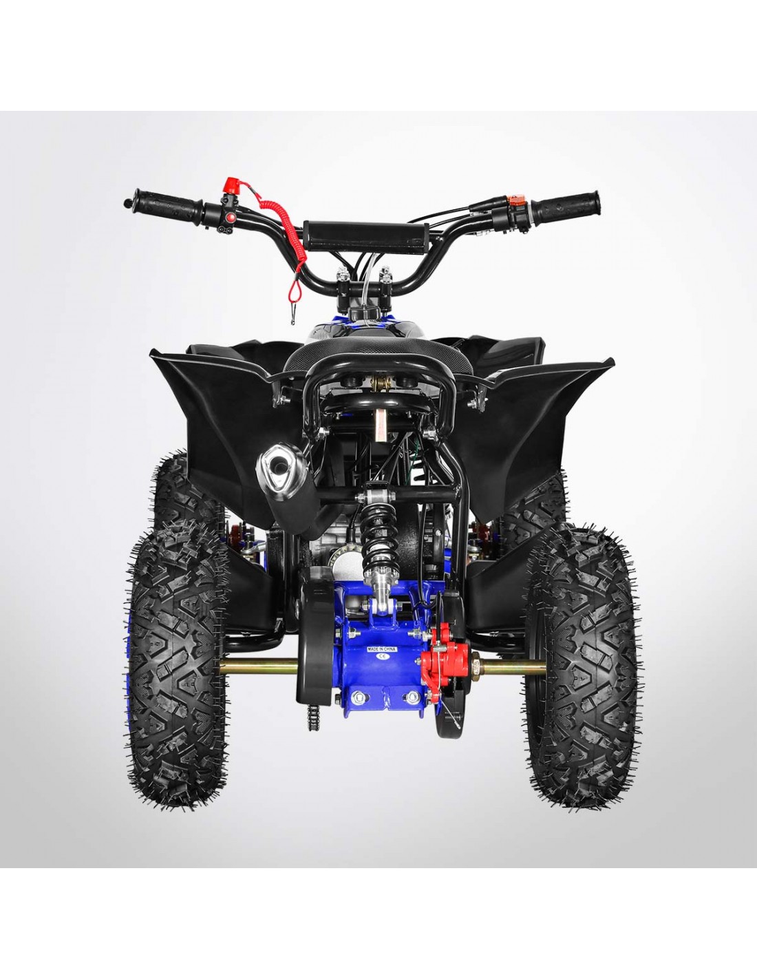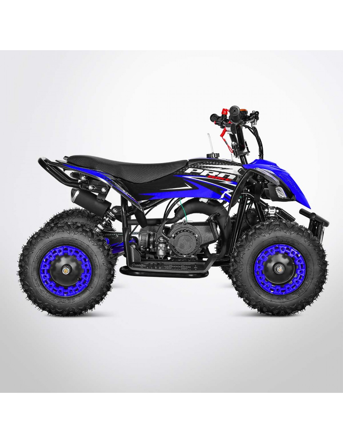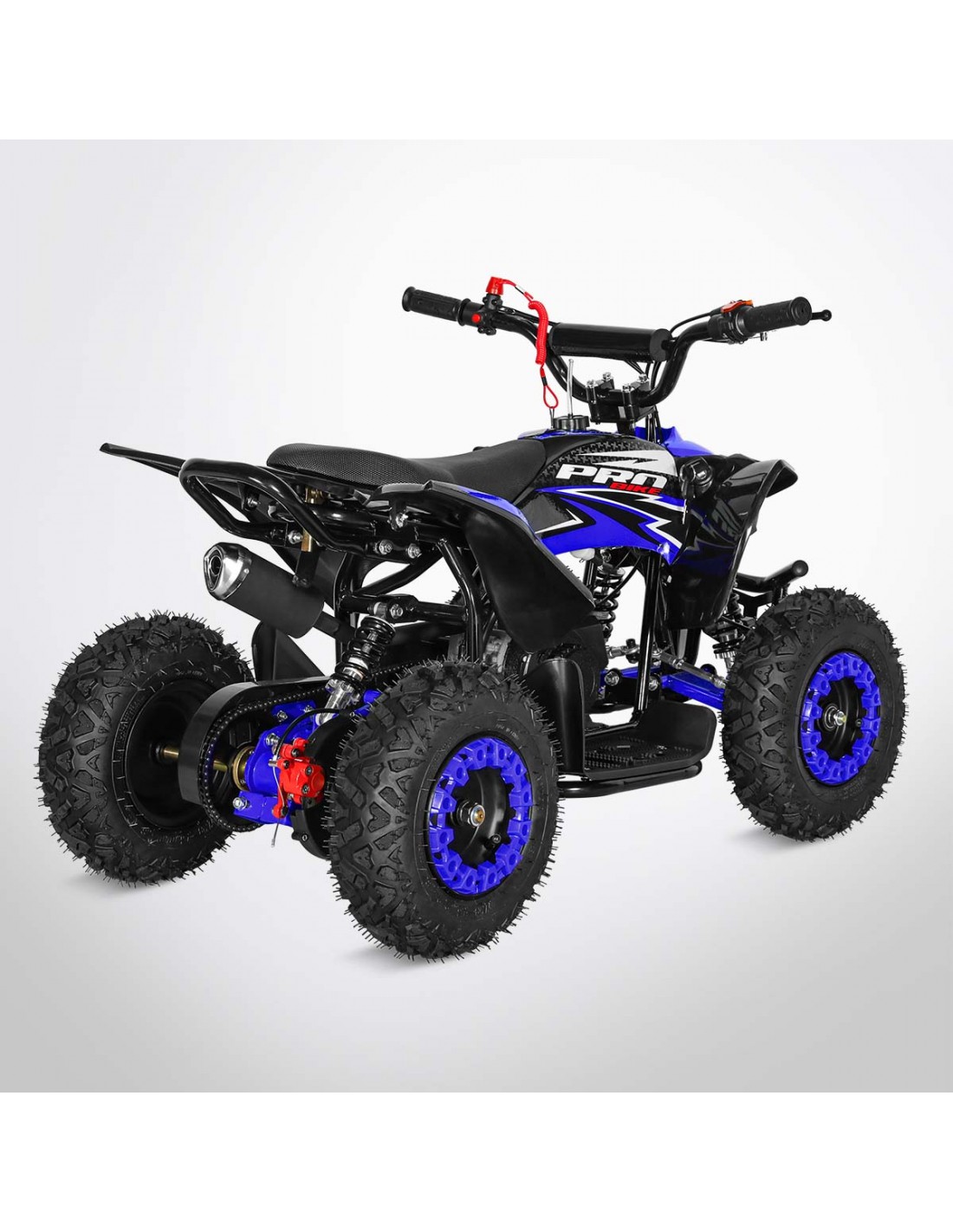 Pocket Quad PROBIKE modèle TYRAX 49 BW6 (Mini ATV) équipé de roue 6 Pouces. Ce quad grâce à de nombreux avantages séduira parents comme enfants ! MODELE HAUT DE GAMME DE CHEZ PRO BIKE !!!! Importateur Francais et distributeur avec un excellent SAV / dispo pièces ! Sa vitesse bridable dès 5 km/h et son coupe circuit type jet ski permettra de mettre pilote et parents en toute sécurité ! Ce quad permettra à l’enfant (dès 3/4 ans) de découvrir le sport mécanique fabuleux qu'est le quad, sans se ruiner et tout en gardant le meilleur rapport qualité prix du marché ! De plus avec ses nombreuses améliorations (voir photos), ce quad s'est fiabilisé avec le temps: lanceur aluminium renforcé, embrayage renforcé, biellettes renforcées, guidon aluminium, freins à disques avant (double) et arrière, chaine renforcée !!!Les + de la marque :- Train avant à bras de suspension séparé !- Colonne de direction monté sur bague (aucun jeu possible)- Biellettes de direction serties et inversées (beaucoup moins de jeu et d'usure dans le temps)- Fusée de train avant monté sur roulements (pas d'usure ni de jeu comparé à du plastique)- Nouveau guidon moins large et mieux adapté aux plus jeunes- Amortisseur avant / arrière réglable et moins dur ! - MOTEUR