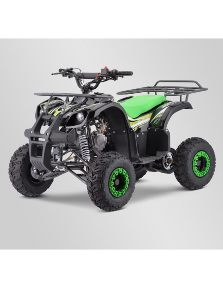 Quad 125cc 4 Temps APOLLO MOTORS HIRO TIGER (ATV 125 cm3) équipé de roue 7 Pouces ainsi que de la marche avant et arrière qui lui permettront de passer n'importe ou ! Ce quad grâce à de nombreux avantages séduira parents comme enfants ! MODÈLE HAUT DE GAMME DE CHEZ APOLLO !!!! Importateur Francais distributeur APOLLO MOTORS avec un excellent SAV / dispo pièces ! Il est équipé du démarrage électrique et d'un coupe-circuit type jet-ski qui permettra de couper le quad en cas de chute pour des raisons de sécurité. De plus sa vitesse bridable dès 5-10 km/h et son coupe circuit type jet ski permettra de mettre pilote et parents en toute sécurité ! Ce quad permettra à l’enfant (dès 10 ans) de découvrir le sport mécanique fabuleux qu'est le quad, sans se ruiner et tout en gardant le meilleur rapport qualité prix du marché ! Son bumper avant, ses grosses roues 7 pouces, son châssis XXL fait de ce quad une réplique du célèbre modèle de chez Polaris ! De plus avec ses nombreuses améliorations (voir photos), ce quad s'est fiabilisé avec le temps: moteur 4 temps robuste et fiable, phare avant, Démarrage électrique, bras oscillant renforcé... - MOTEUR