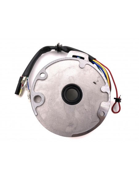 Stator d'allumage 2 Bobines (demi-lune) / Plateau d'allumage / Platine d'allumage pour Dirtbike & Pitbike à démarrage au kick à moteur horizontal de 50 à 160 cm3 qui possède 5 fils de branchements (3 pour l'allumage: rouge/noir, bleu/blanc, vert et 2 pour l'éclairage: blanc, jaune)
